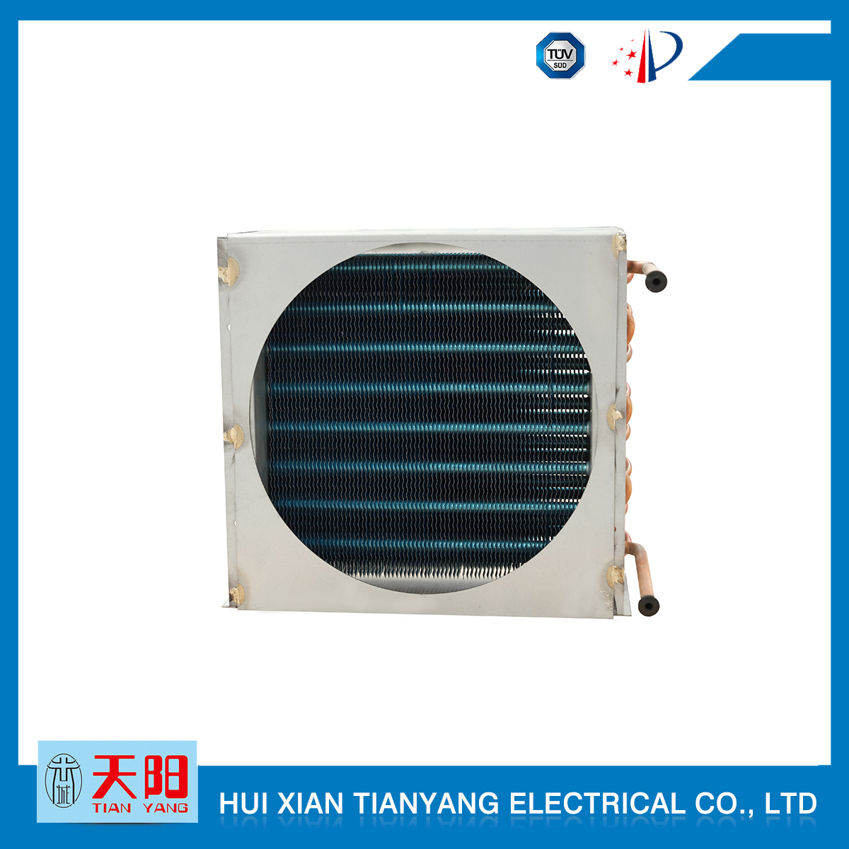 輝縣天陽電器有限責任公司位于肥沃的中原河南省輝縣市學院路中段工業集聚區興業園3號廠房,以制冷設備用冷凝器,蒸發器,熱交換器為主。主要材料為銅管鋁翅片,銅管銅翅片,鋁管鋁翅片。廣泛應用于冰箱冰柜,制冷設備,暖通設備,空調,自動售貨機,冷干機,超市立風柜,冷藏車,烘干機等產品領域。  公司自1998年成立以來,始終堅持:“科技造就產業、質量成就信譽、誠信鑄就輝煌”的質量方針,從產品拓展上堅持“人無我有,人有我優,人優我特的”經營理念,25年來,從1998年開始供應河南冰熊集團下屬的冷柜廠,制冰機廠各種冷凝器;2003年之后,原冰熊集團的精英志士開始在全國各地發展,所到之處依托我公司供貨,以致于多家目前已具行業中佼佼者的公司,從而建立了如凱雪公司,兆邦公司、凌云公司、海寶公司、正雪公司、上海忠云、山東德萊維等幾十余家公司在草創時期的啟蒙供貨商,友好共贏長達十余年,成為我國制冷行業的供應商。以致在2015年初雙匯集團面向社會的招標書中指名要我公司冷凝器、蒸發器指定產品供應商